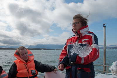As we were standing there, a piece of an iceberg split off, and a piece of it made its way down toward the end of the lagoon. There it got stuck on the shallow end, and after a bit of wobbling, flipped on its side and came to a rest. This was an impressive demonstration of how fast the system re-stablizes.