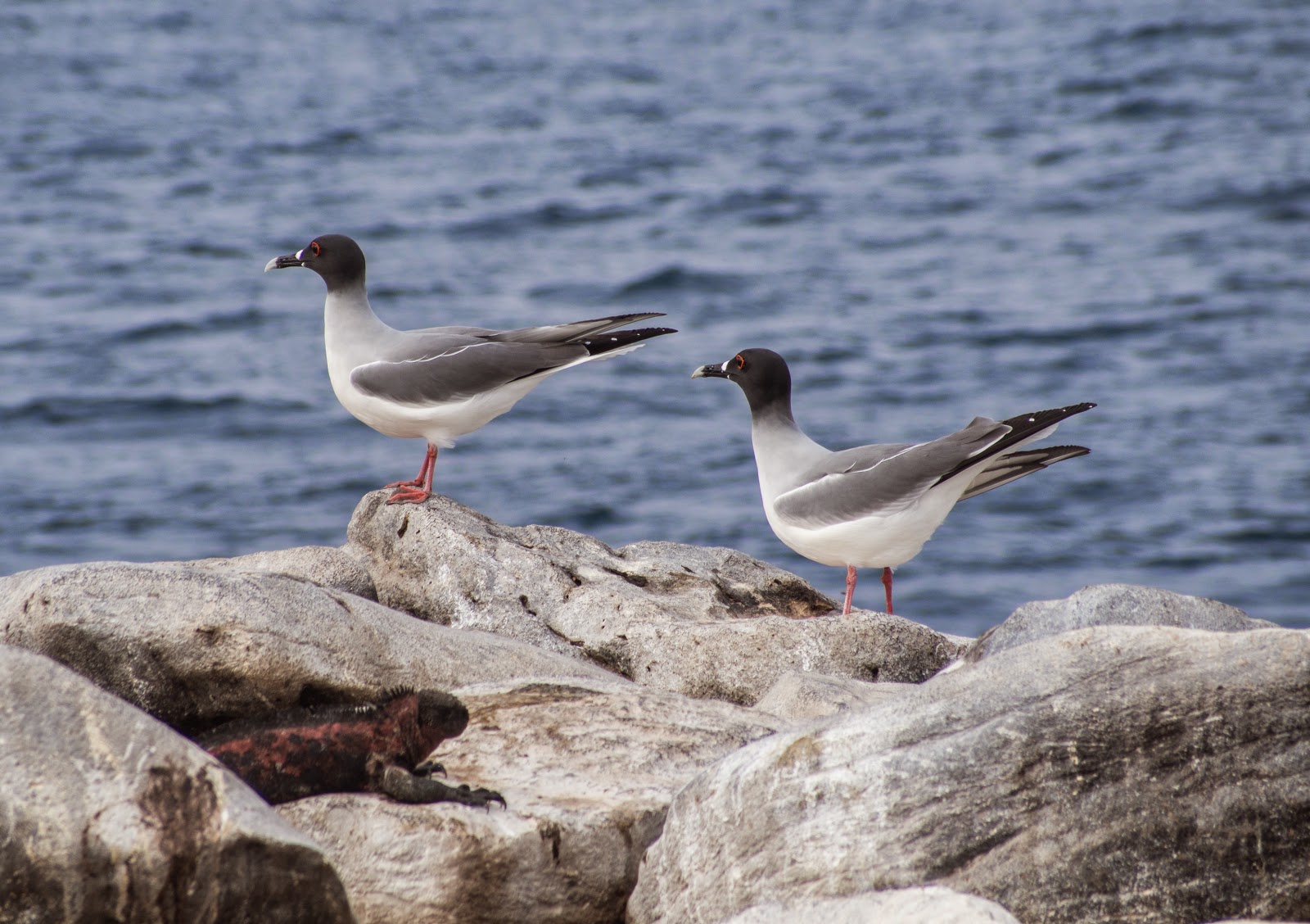 All the rocks around us are covered with large marine iguanas. Here they are larger than those we saw before and have a more pronounced red coloring. The iguanas bunch up in groups on the rocks, waiting for the sun to show up.